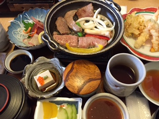お刺身、天ぷら、焼き肉と、贅沢な3品がついたランチ。