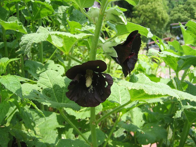 黒っぽい花を咲かせるホリホック。