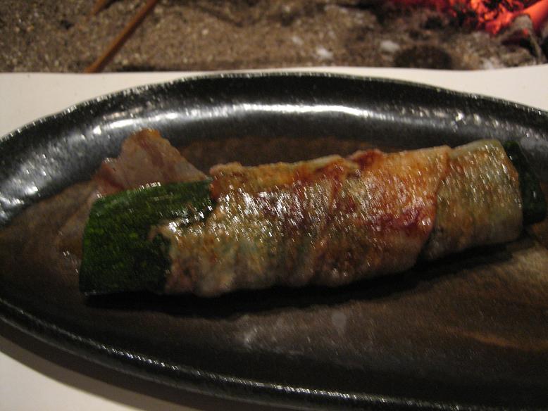 これはえびとズッキーニを黒豚のベーコンで巻いたものです。