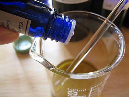 ②チンキ3種をよく混ぜたら、そこへ精油を入れます。精油は全体量のおよそ1%。